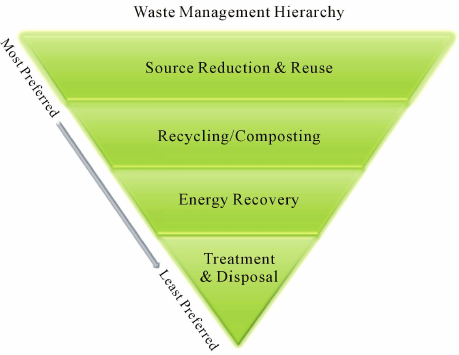 One of Green Oakwood’s primary aims is to reduce waste (e.g. items to landfill). This graphic shows how the biggest effect is made by reducing at source (by avoiding manufacture/purchase) and re-using existing products. After that, recycling is preferred to the other waste management options: